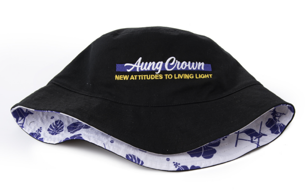Although the hat itself is black, the latest creation by renowned milliner Aung Crown features a colorful logo that evokes the arrival of spring. The bucket hat is black with the brand name embroidered in white, purple and yellow. The inside of this bucket hat is made of white microfiber and digitally printed flat fabric, while the outside is made of black unbrushed cotton twill. Designed with comfort in mind, this hat features two different fabrics on each side.