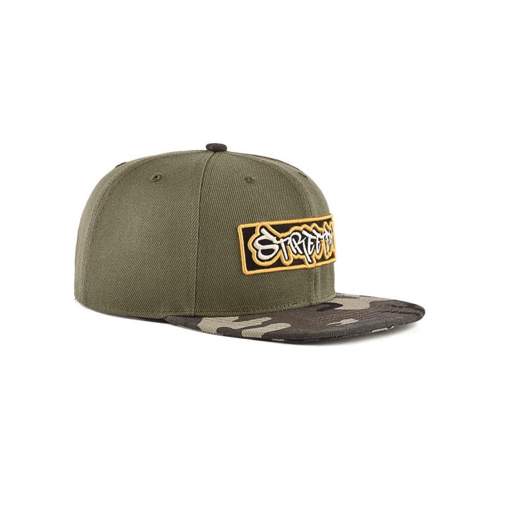 The STREETER olive green snapback hat features a 6-panel construction, providing a structured and refined appearance. It is made from a combination of camo and acrylic fabric, ensuring durability and comfort.