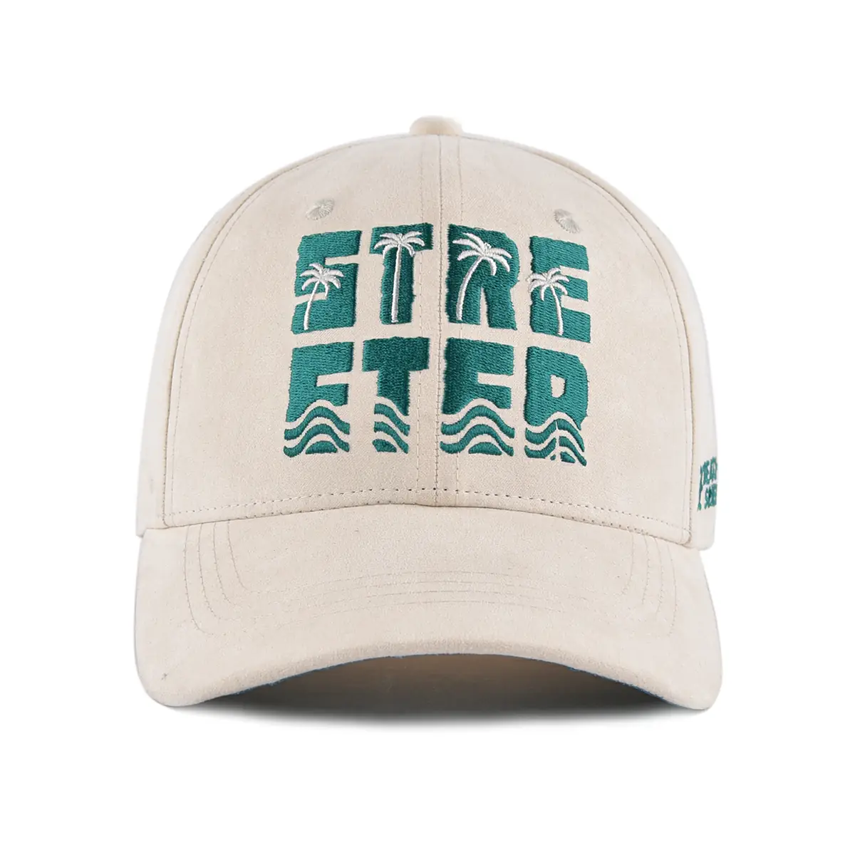 Fine Logos: The Streeter outdoor baseball cap is designed with a flat embroidery logo on the front and a digital printing pattern on the lower brim. The front flat embroidery logo is in capital letters – STREETER. The lower brim digital printing pattern is coconut tree and beach. These patterns are delicate and high-fashion.